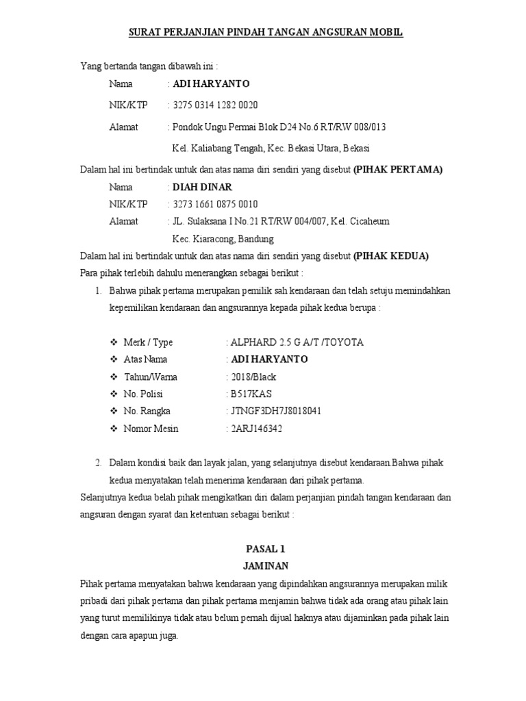 Surat Perjanjian Pindah Tangan Angsuran Pdf